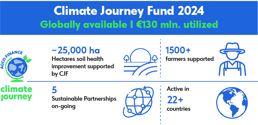 Das Climate Journey Programm von AGCO Finance ist eine jährlich aufgelegte, globale Finanzierungsinitiative. Sie bietet förderfähigen Landwirten attraktive Finanzierungskonditionen für AGCO-Maschinen, um nachhaltige Ergebnisse in ihren Betrieben zu fördern.